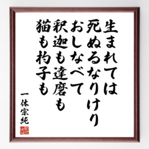 2021年7月31日 / 最終更新日時 : 2021年7月31日 meigen.toweb すべて 幕末の偉人・人物「静観院宮」の辛い時も頑張れる名言など。幕末の偉人・人物の言葉から座右の銘を見つけよう 誠実になれる、幕末の偉人・人物の言葉をご紹介します 正岡子規の俳句書道色紙『川せみや、池を遶りて、皆柳』Z9339>>この言葉を書道で直筆いたします。 君がどんなに遠い夢を見ても、君自身が可能性を信じる限り、それは手の届くところにある。 結婚は雪景色のようなものである。はじめはきれいだが、やがて雪解けしてぬかるみができる。/山本有三 人間というものは、少しやさし過ぎるくらいでなくちゃ、十分やさしくあり得ないのだ。 英雄、英雄を知る/吉川英治 いざという場合になると人間は卑怯か卑怯でないかの二色に分けられる。/大佛次郎 大きな夢をひとつ持つよりも、小さな夢をたくさん持って生きていくほうが人生での楽しみが増える。 僕が嘘をつくのは、それもつまりは、嘘をつかない限り、万事上手くはいかないからなんだ。 『性悪説』を前提にした従来の労働集約型産業のマネジメントでは、人の心は動かない。『私はこう考える』と、社員の誤解を恐れず問題の本質を明らかにし、わかりやすく説明する。自ら胸襟を開かないことには道は、 自分を信じて行かなければいけない。教わるものは遠慮なく教わるがいいが、自分の頭と眼だけは自分のものにしておかなければいけない。 全自然は幾何学模様のしるしに表されている。 慣れは第六感であり、他のすべての感覚を支配する。/アラン 不便が不幸だとは限らない。 3年続けば、あとはいくらでも続く 私は女じゃないんだよ、人間なんだよ。女をやってる人間なんだよ。 自分を変えたいと思い、行動を起こしたならば、しぱらく続けてみることです。 釣れないときは、魚が考える時間を与えてくれたと思えばいい。 結婚すると、相手を自由な人間としてではなく、一種の自分の所有物として扱うようになる可能性がある。 生きて生きて生きまくれお前の命は生きるために流れている 自分が死ねば、世界も宗教も、神そのものも消滅するのだ。/正宗白鳥 日本には統治者と被統治者の二種しかない。 名言書道色紙『暇ほど毒なものはない』Z4831>>この言葉を書道で直筆いたします。 人生も将棋も話し合いである/升田幸三 私たちは聖者と違って、自分の敵を愛するのは無理かもしれない。けれども、自分自身の健康と幸福のために、少なくとも敵を赦し、忘れてしまおう。嫌いな人について考えたりして、1分たりとも時間を無駄にしないことだ。/ググイ=デール 気取った料理を気取って食わせる料理人はバカ。 精神のビタミン剤である文化とは何かというと、いい美術に接し、いい本を読み、いい音楽を聞いて、スポーツをしてということです。簡単なことです。 文章が上手い人じゃなくて、人生が小説のようになってる人が小説家。みんな人生で書いてるんです。何かがあって、その軌跡の上を滑っていくわけ。漫画家もそう。 死ぬる刹那(せつな)の純粋だけは、信じられる。けれども、この世のよろこびの刹那は、どうにも、あとしまつができない。花火は一瞬でも、肉体は、死にもせず、ぶざまにいつまでも残っているからね。 もしも二人がうまくやっているように見えるなら、一人が耐えているのだ。 俺にはプロデューサーなんて、ろくに歌えない、ギターも弾けない人間がやることのように見えてしまうんだ。歌えない奴が偉そうにふんぞり返ってる姿イコール、プロデューサーなんだよ。 革新的商品だけがすべての人々に利益をもたらす/安藤百福 決して、決して、決してやめてしまうな。/C・チャップリン 恋人として男と女とが違う点は、女は一日中恋愛をしていられるが、男はときどきしかできないということである。/サモセット・モーム あなたの歌をうたえ、空を見上げながら。 世の中で何よりも大切なものは自分自身である、がしかし、そのように考えているのは自分だけではない。つまり、自分を大切に思うなら他人をも大切にすべきであると、少年は仲間の存在によって気づくのだ。 一番はもちろん尊いしかし一番よりも尊いビリだってある 私の恋の成立不成立は、チャンスに依(よ)らず、徹頭徹尾、私自身の意志に依るのである。 充実感は日常生活の中に隠れている。/シャア・アズナブル 人の一生はながいものだ。一足跳びに山の頂上にあがるのも、一歩一歩としっかりと登ってゆくのも、結局は同じこと。むしろ一歩ずつ登るほうが途中の草木や風物を見ることができるし、一歩一歩を慥/山本周五郎 スウィングが難しいというのは、演奏していく中で見につけるしかないんだ。/アーネスト・ハスキンズ 主導権を取ってゲームを戦いなさい。自信が結果を変えるわ。 自分の無知さ加減がどれくらいか、それがおよそ計れるようになってはじめて、人間は賢くなる。/W・ロジャース 聖徳太子の名言書道色紙『篤く三宝を敬へ』Z8863>>この言葉を書